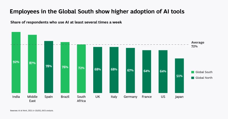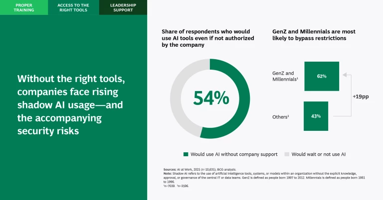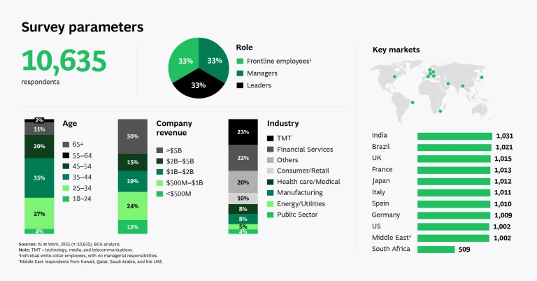 These findings emerge from BCG’s annual AI at Work global survey of employees. (This year’s survey covers 11 countries and regions and more than 10,600 leaders, managers, and frontline white-collar employees. The results are outlined more comprehensively in the accompanying slideshow.)