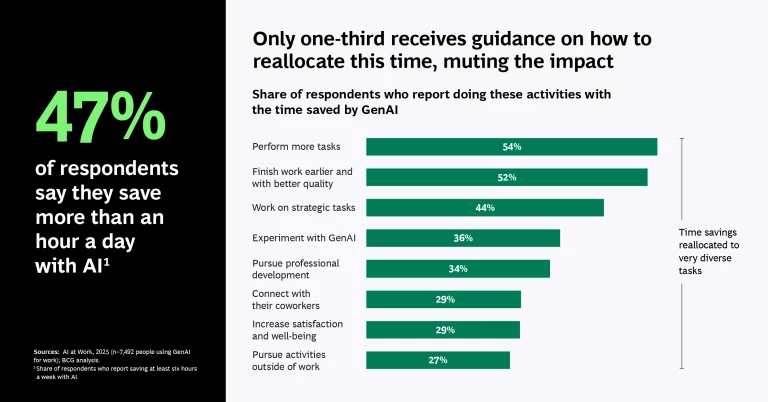 Companies actively reshaping their workflows with AI benefit in many ways that generate value for the organization. Their employees save significantly more time than those in companies where the technology is less integrated into the workday. In addition, employees’ decision making sharpens and they work on more strategic tasks.