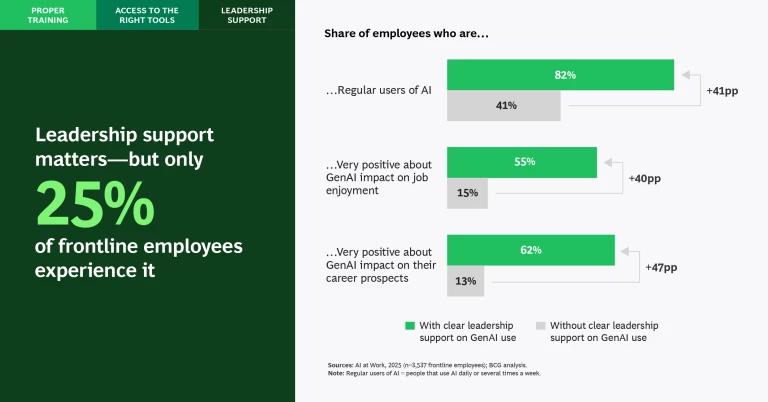 - Provide leadership support. When leaders demonstrate strong support for AI, frontline employees are more likely to use it regularly, enjoy their jobs, and feel good about their careers. For example, the share of employees who feel positive about GenAI rises from 15% to 55% with strong leadership support. Only about one-quarter of frontline employees say they receive that support.