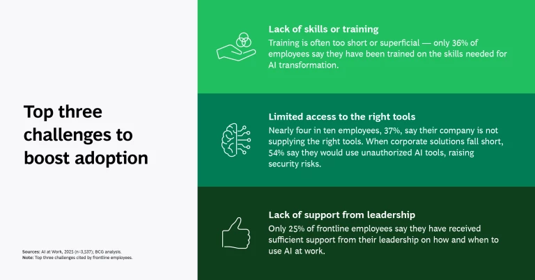 The ability of companies to reshape workflows depends heavily on the engagement of frontline employees. The survey suggests ways for companies to help these employees break through the AI “silicon ceiling.”