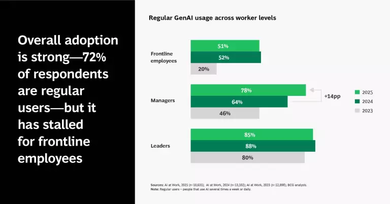 While more than three-quarters of leaders and managers say they use generative AI (GenAI) several times a week, regular use among frontline employees has stalled at 51%.