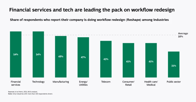 One-half of companies, led by those in financial services and technology, are moving beyond productivity plays (what we call Deploy) to redesign workflows (Reshape).