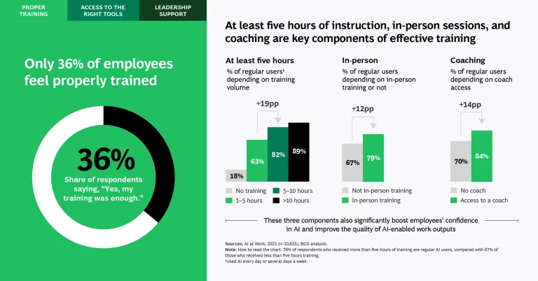 - Provide proper training. When companies train their employees in AI, they are more likely to be regular users and to express confidence in the technology. Regular usage is sharply higher for employees that receive at least five hours of training and have access to in-person training and coaching. Only one-third of employees say that they have been properly trained.
