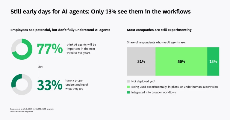 AI agents—smart digital assistants capable of learning, reasoning, and handling complex tasks independently—have been receiving a lot of buzz. But the survey reveals they are still in their infancy. Just 13% of employees see them deeply integrated into their daily workflows. Only one-third of employees understand how these sophisticated tools function.