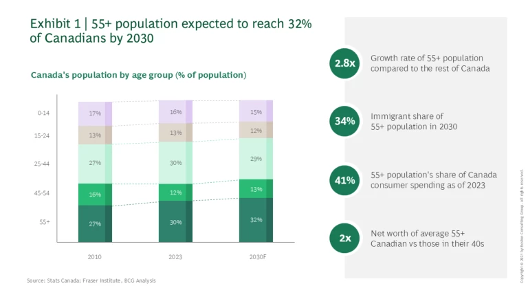 The 55+ segment is the largest and fastest-growing demographic in Canada. By 2030, this segment, will make up 32% of the population and nearly 45% of total consumption. They hold immense financial power, with an average net worth twice that of people in their 40s, bolstered by investment gains and rising property values.