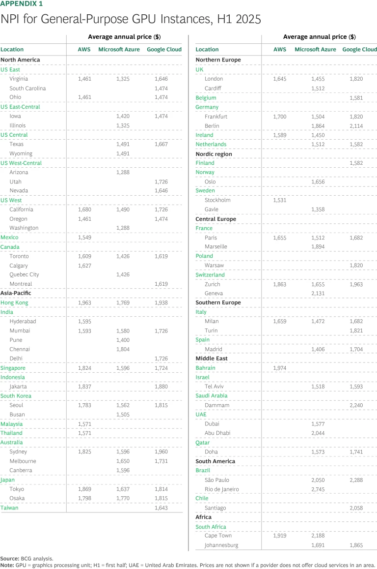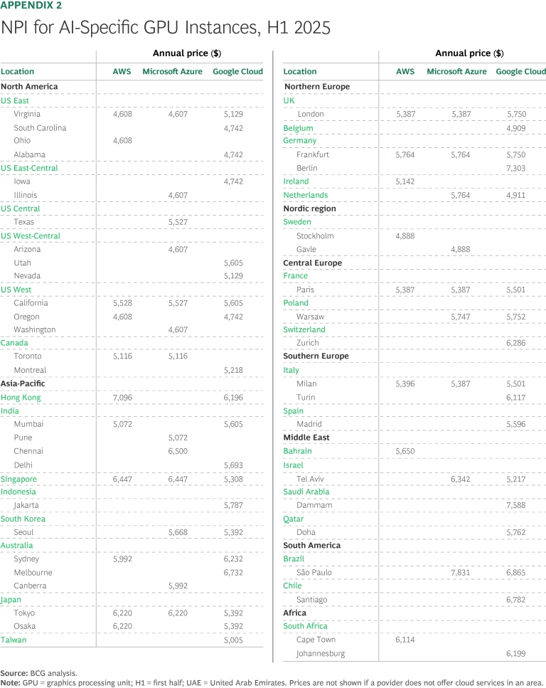 Across regions, there are notable pricing differences to use AI-specific graphics processing unit (GPU) instances, with AWS and Azure offering a clear cost benefit in the Eastern US over Google Cloud. (See Exhibit 1.) AWS and Azure also frequently have very close pricing in the Western US and in European hubs. Regionally, the cheapest AI-specific GPU instances are still in North America and the Nordic countries, while most of those in Europe and Asia‑Pacific range from $5,000 to $6,500. (See Appendix 2.) This range generally applies to Africa and the Middle East as well, and prices peak above $7,000 in South America. AWS and Azure shadow each other almost everywhere, diverging mainly in South America and the Middle East, whereas Google Cloud is slightly cheaper in Asia-Pacific and Europe where it has T4 capacity.