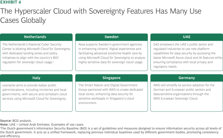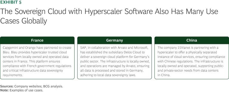 Several major cloud providers have developed sovereign cloud solutions that are tailored to the different regulatory and sovereignty needs worldwide. At a minimum, these solutions address data sovereignty, operational sovereignty, and technological sovereignty. (See Exhibit 6.)