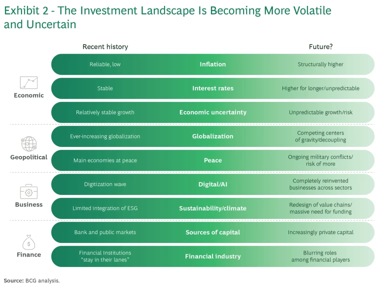 The investment industry at large is moving fast to take into account this new reality: asset owners and asset managers (including alternative asset managers) are shifting their mix of asset classes, their risk appetite, and their investment thesis in each asset class. For example, the current interest rate regime is pushing many leveraged buyout funds to move from a primarily financial play to a wider range of value creation strategies, including business transformation as a key lever.