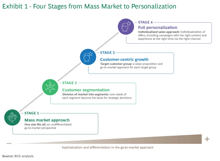 We have developed a roadmap to help insurers move from the traditional service model toward full personalization and organized it into four stages. (See Exhibit 1.) For most of its existence, the industry has been at the first stage: the mass market approach. This is a one-size-fits all perspective in which there is little or no differentiation in product or service offerings. However, to gain additional market share, it is becoming essential that insurers evolve to stages two (customer segmentation) and three (customer-centric growth) and eventually move toward the fourth stage (full personalization). That means dividing existing and potential customers into strategic segments and targeting each group with a unique value proposition and go-to-market plan.