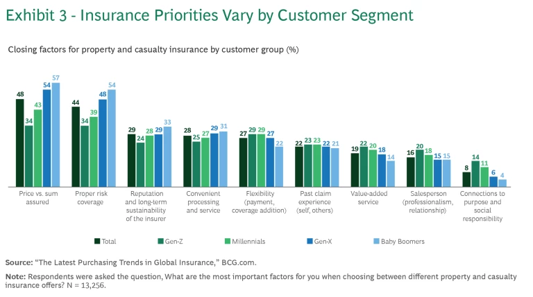While the data about a customer’s demographic factors creates a base, it is also important to categorize customers with a focus on their core needs when it comes to insurance. For example, in a 2023 BCG study of purchasing trends, we found that when customers weighed one property and casualty policy against another, the importance of factors such as price, risk coverage, and reputation of the firm varied significantly by age. (See Exhibit 3.)