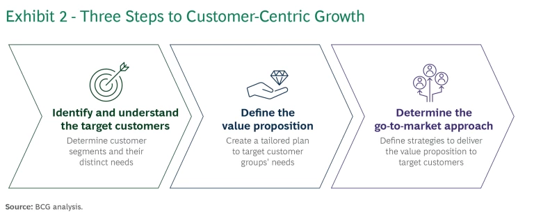 Insurers should be bold and innovative in building a customer-centric strategy. To do that, we recommend that they take three steps. First, identify the target customers by dividing the market into several groups and work to understand their needs. Second, create an operational plan for each group to determine the value proposition that will appeal to those customers. Third, decide on a go-to-market strategy that will deliver the value proposition. (See Exhibit 2).