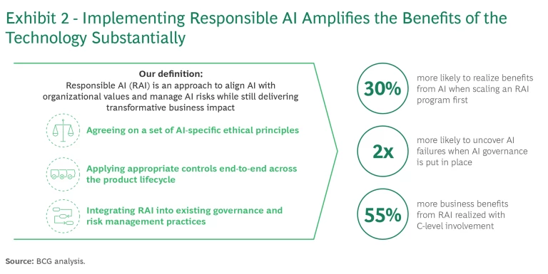 Embracing RAI is not just a matter of ethical compliance but also a strategic imperative and a way to fully realize the benefits of the technology (see Exhibit 2). In a period when AI is increasingly under scrutiny by regulators for the potential harm it could inflict, RAI helps companies build reputations for being on the right side of the ethical divide and for taking their purpose and company values—including social responsibilities—seriously. Companies that embrace RAI attract customers, employees, and investors who prefer to be involved with organizations that are forward-thinking and trustworthy, perhaps believing that these organizations are also more likely to be innovative and ahead of the curve with other essential initiatives that affect growth directly.