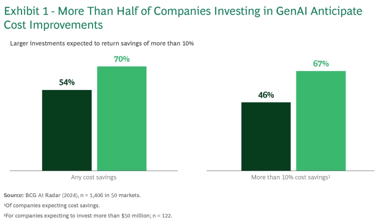 GenAI builds on traditional AI, driven by advancements in deep learning and data proliferation. This evolution is not merely a technological upgrade but a strategic tool that’s reshaping organizational landscapes. Moreover, the emergence of GenAI is perfectly timed, riding a surge of interest in AI in all its forms. According to a recent BCG survey of 1,400 C-suite executives, 85% of respondents plan to increase their AI/GenAI investments in 2024. Moreover, 67% of companies investing $50 million or more anticipate cost savings of more than 10%, and 80% of them expect the technology to expand market access.
