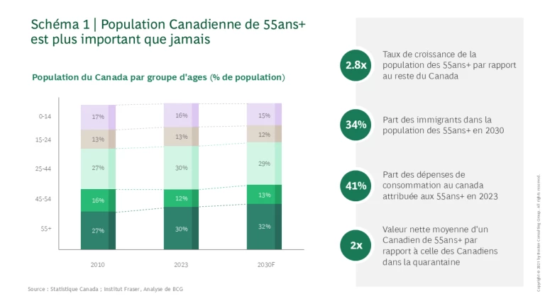 Le segment des 55 ans et plus est le segment démographique le plus important et celui qui connaît la croissance la plus rapide au Canada. D’ici 2030, ce segment représentera 32 % de la population et près de 45 % de la consommation totale. Ce segment dispose d’un immense pouvoir financier, notamment une valeur nette moyenne deux fois supérieure à celle des quadragénaires, grâce aux gains d’investissement et à l’augmentation de la valeur des biens immobiliers.
