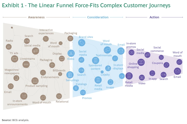 Marketers have long understood the complexity of these journeys. But given limited internal resources and the vast number of potential touchpoints, they have traditionally relied on simplified frameworks to guide their efforts. For years, this has meant force-fitting the complex array of touchpoints into a linear, funnel model. (See Exhibit 1.) While this model can be useful for guiding strategy, budget allocation, and communication, it risks missing opportunities because of misallocated resources or wrong messaging. Instead, marketers need a more flexible framework that better aligns with consumers' actual journeys.