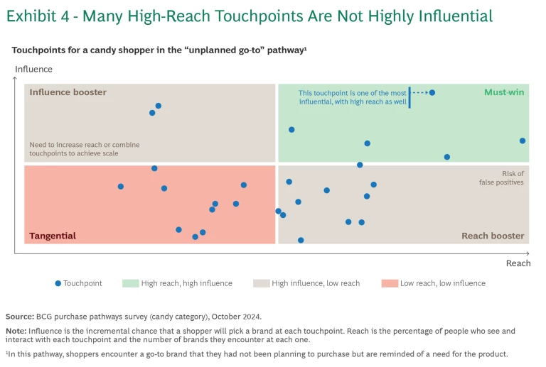 While reach is still essential, it is crucial to keep in mind that different types of reach do not have equal value in terms of influence. High-reach touchpoints give brands wide exposure, but they don’t always drive influence. (See Exhibit 4.) For example, marketers focused solely on reach may incorrectly assign equal value to an ad that consumers scroll past quickly, to a 15-second nonskippable video, and to content that captures minutes of attention and creates a lasting impression.