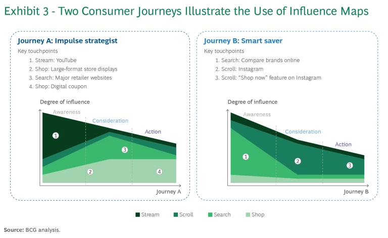 This flexibility becomes possible by shifting from the linear funnel to “influence maps.” (See Exhibit 2.) Modern consumer journeys revolve around four key behaviors: streaming, scrolling, searching, and shopping. Unlike the rigid, sequential approach of the funnel, where each of these behaviors is confined to specific stages, the influence map recognizes that they occur across the entire journey, often overlapping and influencing multiple stages simultaneously.