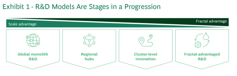 As companies move along this continuum, they become better equipped to respond to rapid changes in local consumer needs and market conditions, providing tailored solutions efficiently and effectively. Fractal-advantaged R&D represents the mature state of this evolution, where the flexibility and responsiveness of the R&D structure are maximized.