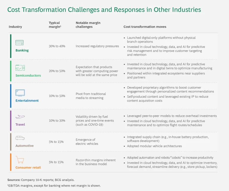 Realizing sustained cost advantage requires a shift in mindset and a willingness to fundamentally transform the organization, including capabilities, processes and systems, roles and responsibilities, governance, and decision making. Companies that shy away from challenging the status quo won’t get beyond incremental savings that will likely dissipate within a few years.