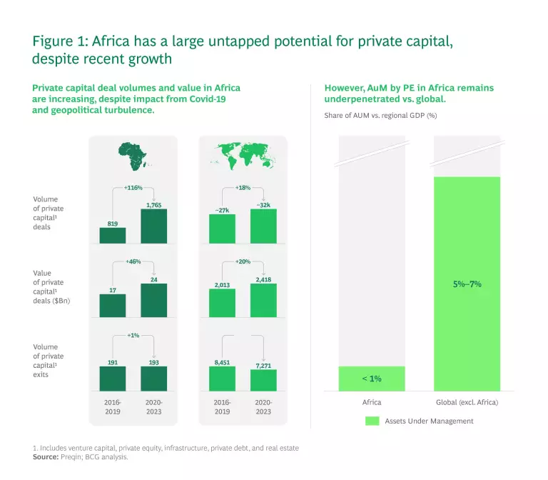 Africa today offers opportunities across key growth sectors for private investors. Growth in private capital deals on the continent has outpaced global averages in both volume and value, rising by 116% and 46%, respectively, between 2016 – 2019 and 2020 – 2023. Yet assets under management remain underpenetrated; they represent less than 1% of GDP, compared to the global average of 5% to 7%, indicating there is substantial room for growth.