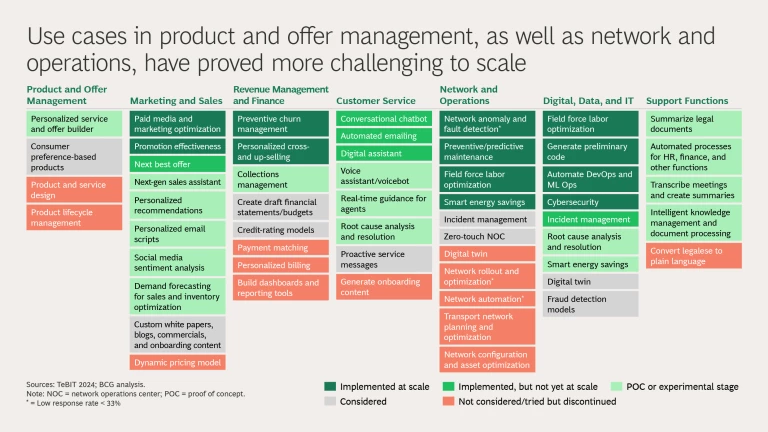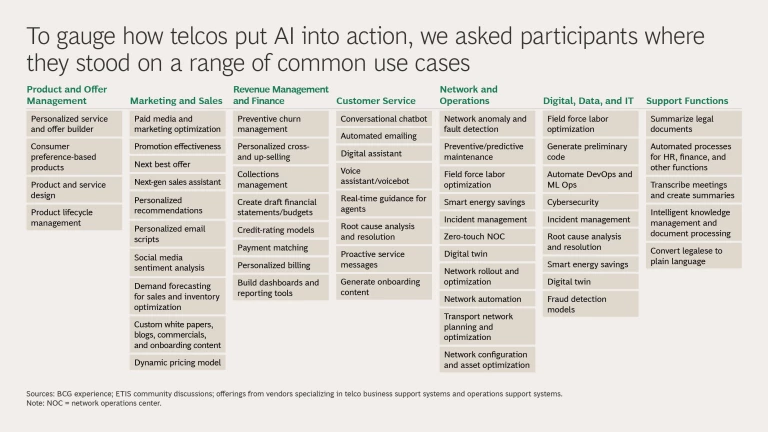 To see where telcos stand on putting AI and GenAI into action, we compiled a list of common use cases, based on BCG experience, discussions in the ETIS community, and out-of-the-box solutions. The use cases covered areas including customer service (conversational chatbots, automated email generation, real-time guidance for agents); marketing and sales (next-gen sales assistants, among other use cases); revenue management and finance (churn management, personalized cross-selling and upselling); and digital, data, and IT (code generation, cybersecurity, and so on).
