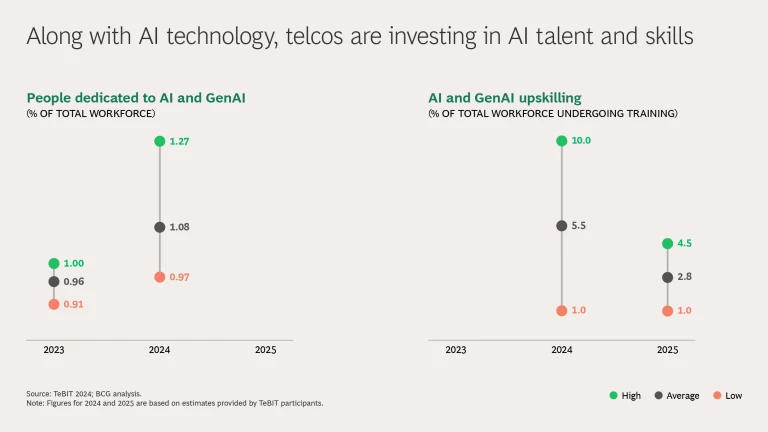 Findings from this year’s telco IT benchmark (TeBIT) study, jointly developed by ETIS—The Community for Telecom Professionals—and Boston Consulting Group, raise concerns that operators may not be realizing, or be poised to realize, the full value of AI and GenAI. (See “About the TeBIT Benchmark.”)