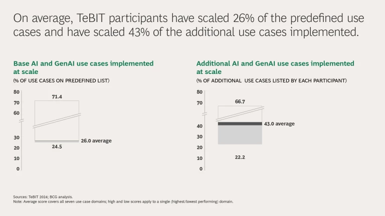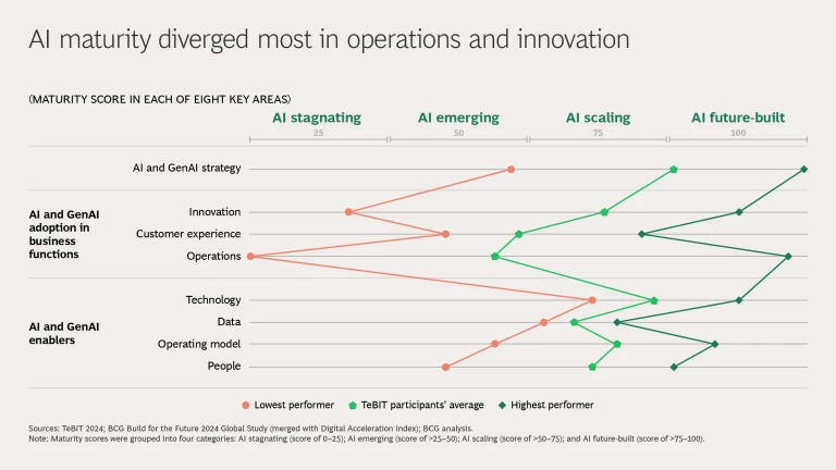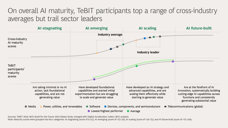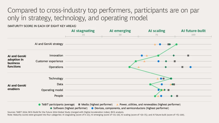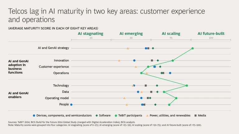 So how, exactly, are telcos positioned on the technology? The TeBIT survey asked respondents to rate their maturity on two dozen capabilities relevant to AI and GenAI. These capabilities covered eight areas: strategy, innovation, customer experience, operations, technology, data, operating model, and people. In preparing an October 2024 report on AI, BCG asked these same questions of companies across industries. The results from that study enabled us to see where TeBIT participants sit on a cross-industry spectrum.