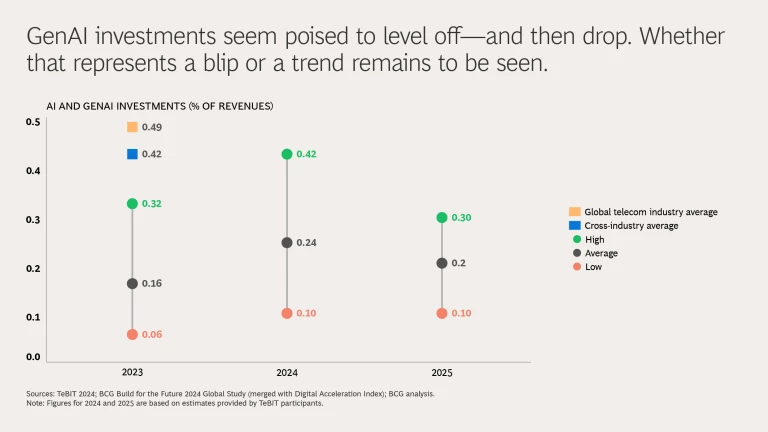 This raises the issue that developing, building, and scaling use cases requires investment. The TeBIT study found that on average, participants’ AI and GenAI spending amounted to 0.16% of revenues in 2023, less than both the global telco industry average (0.49%) and the cross-sector average (0.42%). Further, we see evidence that investment may be leveling off. For 2024, TeBIT participants expect their AI and GenAI spending to amount to 0.24% of revenues before dropping to 0.2% for 2025. This, too, is surprising. We would expect investment levels to increase for at least the next few years.