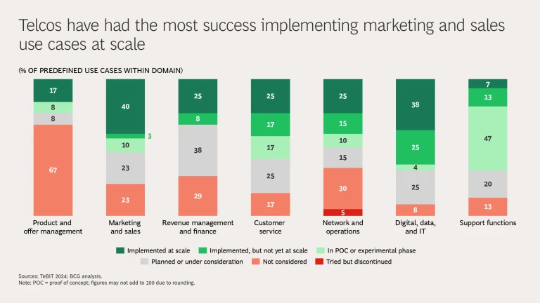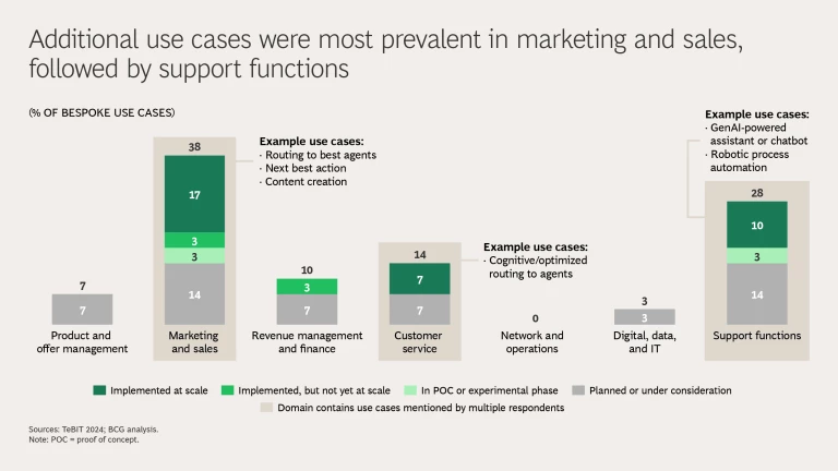 We also found that telcos often go their own way on use cases. We asked participants to describe use cases they have implemented—or have in the works—that weren’t on the predefined list. Telcos reported that they have implemented at scale 43% of this bespoke list. Given that nearly 40% of the additional use cases were in marketing and sales, which may be easier to scale, the higher proportion of successes—use cases that have moved beyond pilots or otherwise limited deployment—might not be surprising.