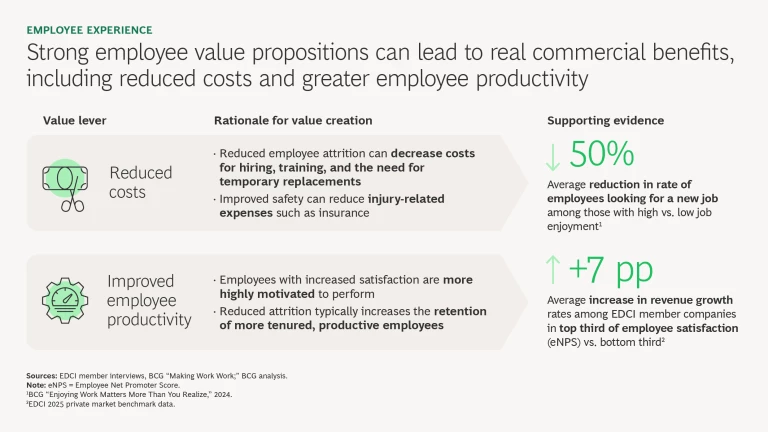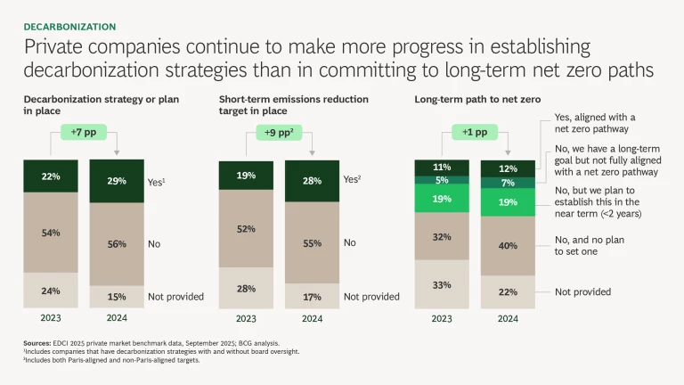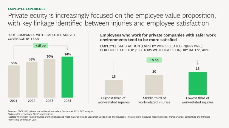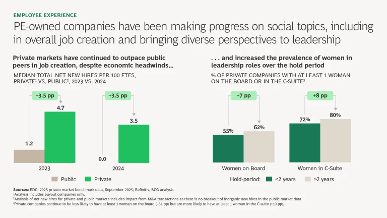 Since last year’s report, private companies have continued to make progress on environmental sustainability. The proportion of companies with decarbonization strategies and short-term emissions reduction targets each increased by 7 to 9 percentage points. This contrasts with the smaller 1 percentage point improvement in long-term net zero commitments, suggesting that in today’s climate GPs are more focused on rolling up their sleeves and driving near-term real-world outcomes than on making long-term public commitments. Meanwhile, job growth at PE-owned companies continues to outpace public companies, while GPs are increasingly focused on how improvements to the employee experience can boost retention and productivity and reduce injury-related expenses.