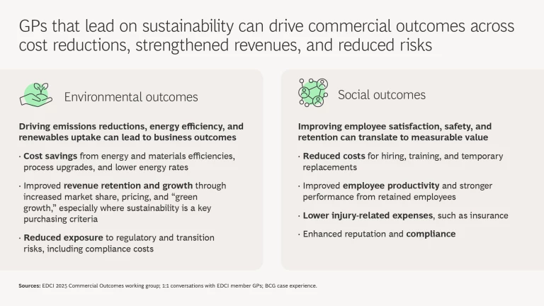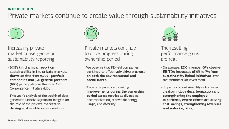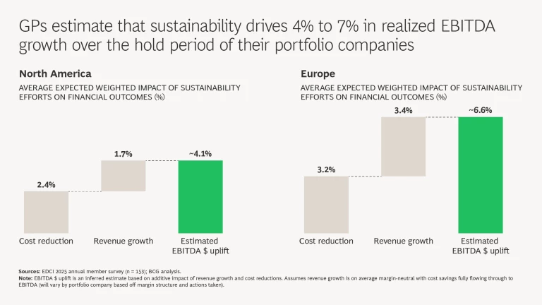 Produced in collaboration with the ESG Data Convergence Initiative (EDCI), this year’s report compiles a wealth of data from over 9,000 portfolio companies—more than four times the number of companies as in the inaugural edition of the initiative—and 320 general partners (GPs) spanning private equity, infrastructure, and private credit. These GPs estimate that, on average, their sustainability efforts improve realized EBITDA by 4% to 7% over the hold period of their portfolio companies.