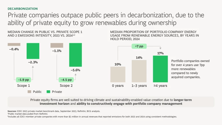 The private markets do lag the public markets in some areas, including board diversity and renewable energy usage. Still, during their hold periods private companies continue to make improvements across various sustainability metrics that often outpace their public peers. The inherent investment approach of PE firms—their long-term focus and considerable influence over the management of their portfolio companies—positions them to effectively drive sustainable value creation, where such efforts are material to business performance.