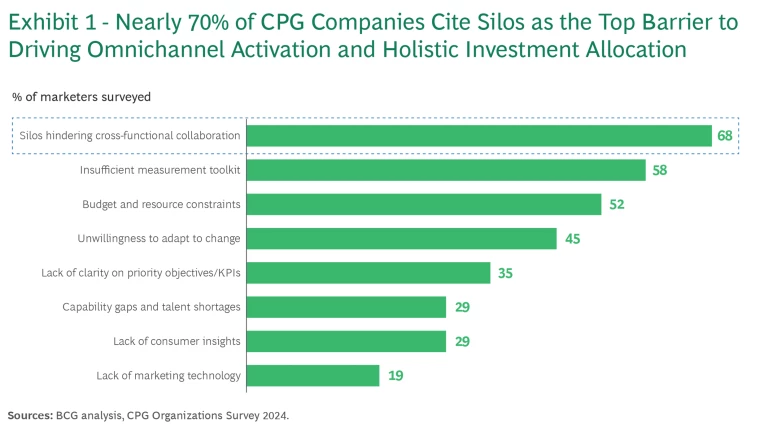 A recent BCG survey found that 75% of CPG marketing leaders said omnichannel investment allocation and activation are their biggest challenges. Of those who gave this response, 68% said that organizational silos and poor internal collaboration are the biggest hurdles to overcome. (See Exhibit 1.)