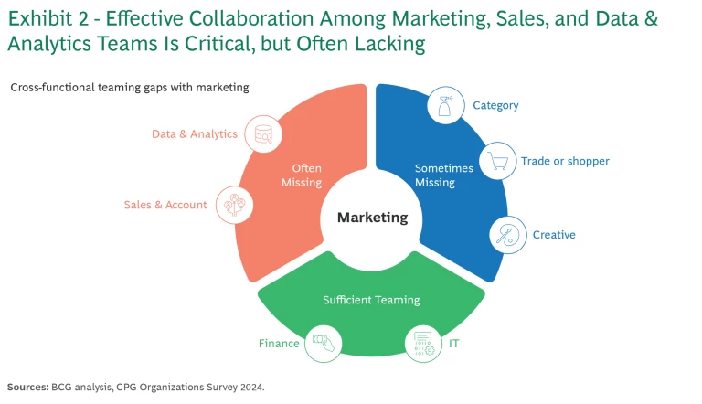 It’s a difficult task. Marketing and sales functions share similar goals but have different timeframes, capabilities, and access to information. They both typically work well with finance and IT; however, marketing often fails to partner sufficiently with data and analytics and sales and account teams—areas where collaboration is required to achieve desired outcomes. (See Exhibit 2.)