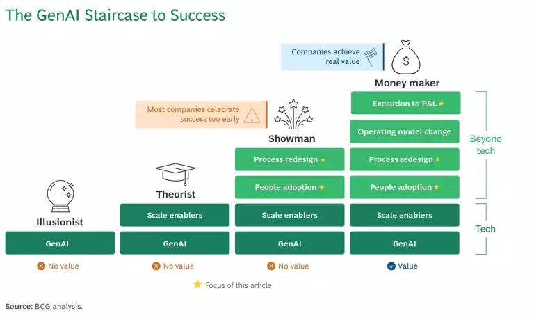Achieving widespread adoption is fundamental to the success of any AI or GenAI implementation. When users across an organization embrace these tools and integrate them into their daily workflows, they unlock the tools’ potential for transformative impact. Introducing agent-based orchestration across different GenAI solutions can further boost adoption by simplifying usage and making the technology accessible on a mass scale. However, adoption alone is no guarantee that the tools will deliver their full value. Companies must thoughtfully redesign their processes and workflows to enable the seamless integration of AI and GenAI capabilities into core operations and to maximize their intended value.