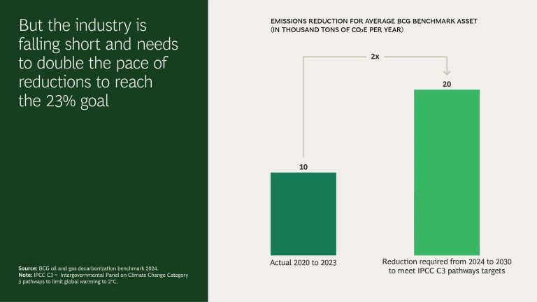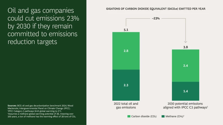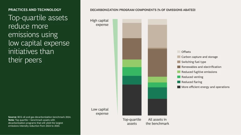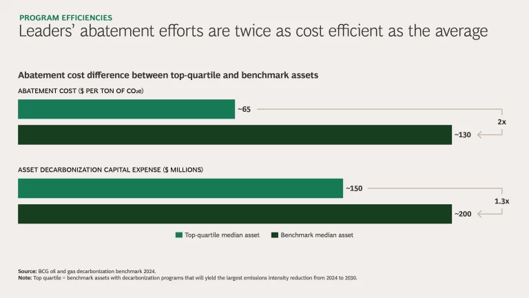 The industry is actively working to reduce such emissions. According to a first-of-its-kind oil and gas sector benchmark created by BCG, industry decarbonization leaders are on track to hit self-imposed targets of cutting emissions from assets 23% by 2030. Moreover, leaders are able to reduce emissions at half the cost per ton of CO2e, on average, compared to abatement efforts conducted by their peers.
