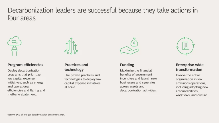 BCG has previously identified actions that oil and gas industry decarbonization leaders are taking to reduce CO2e abatement costs, including implementing changes at individual assets and integrating work across assets and regions to optimize results. The benchmark enables us to translate insights into actions that set decarbonization leaders apart. These can be divided into four categories.