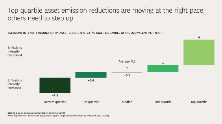- Between 2020 and 2023, benchmark companies with assets in the top quartile of decarbonizers reduced CO2e intensity by at least 1 kilogram of CO2e for every barrel of oil equivalent (boe) a year—twice as fast as the average. Top quartile assets’ decarbonization programs address 85% of their total emissions, compared to 70% for all assets.