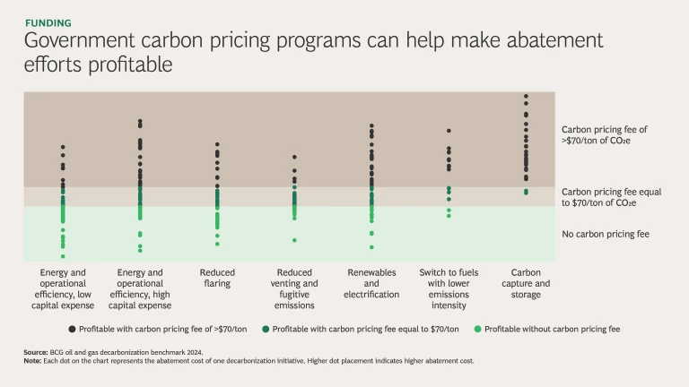 Decarbonizing could be hard for companies to achieve without outside encouragement. Governments can help by incentivizing companies to decarbonize through programs such as carbon pricing, where fines or fees are imposed on emissions. In common carbon pricing schemes, greenhouse gas producers have the option to pay a fine or fee to continue emitting at the same level, or avoid it by emitting less. Benchmark findings bear out the difference that such programs can make in cutting emissions and making abatement efforts more profitable. From 2020 to 2023, oil and gas industry assets in regions with carbon pricing cut average emissions intensity twice as much as assets in areas without it—2% compared to 1%. Our research also found that if benchmark companies operated in regions with a carbon pricing fee of $70 per ton of CO2e, twice as many of their abatement initiatives would show a profit—60% compared to 30%. That’s because more of them would opt to spend on initiatives to lower emissions over paying penalties that ultimately would end up costing more.