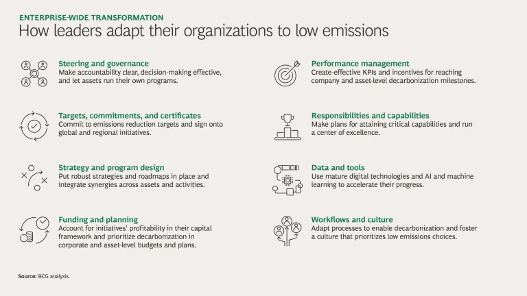 Decarbonization leaders maximize their efforts by involving the entire organization in abatement efforts from day one. They start with a solid program that incentivizes low-emissions choices. They give asset teams ownership for making changes but use key performance indicators and other metrics to measure progress toward goals. They use initiatives to reduce costs and improve productivity per barrel. And they use upskilling, reskilling, and outside experts to ensure that the workforce has the capabilities necessary to put decarbonization programs into practice.