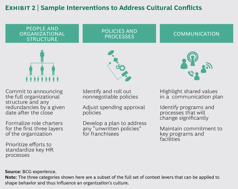 Without a fundamental understanding of how context drives behavior, it’s difficult to see how the decisions made during a merger will shape the culture of the combined entity. (That’s precisely why it’s important to consider the elements of context early on, since many will change in the course of the merger.) So to diagnose the two cultures properly—and lay the foundation for ultimate postmerger success—it’s crucial to understand more than the behaviors themselves. You must also understand which elements of the organizational context are driving those behaviors. Coming back to the example of BrightWorld and CleanNation, to mitigate the cultural differences between these two companies, BCG recommended a plan of action that focused on three broad categories: people and organizational structure, policies and processes, and communication. (See Exhibit 2.)