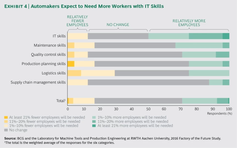 Although the greater use of robotics and computerization will reduce the number of jobs in assembly and production, the number of manufacturing jobs requiring skills in IT and data science will increase. Approximately 50% of automotive respondents said that they expect to employ more workers with IT skills, and approximately 25% expect the number of IT employees will increase by more than 10%. (See Exhibit 4.) Approximately one-third of respondents expect to need more workers with competencies in maintenance and quality control, while about 25% expect to need people with production planning and logistics skills. These additional staffing resources will be needed to respond to the insights provided by the trove of new data available.