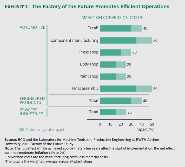 The Boston Consulting Group recently conducted a study that addressed these questions. The study focused on a global survey of more than 750 production managers from leading companies in three industrial sectors: automotive (which includes suppliers and original equipment manufacturers, or OEMs), engineered products, and process industries. The goals were to define a vision for the factory of the future in 2030, assess the benefits, and create a roadmap for implementation. Our research partner was the Laboratory for Machine Tools and Production Engineering at RWTH Aachen University.