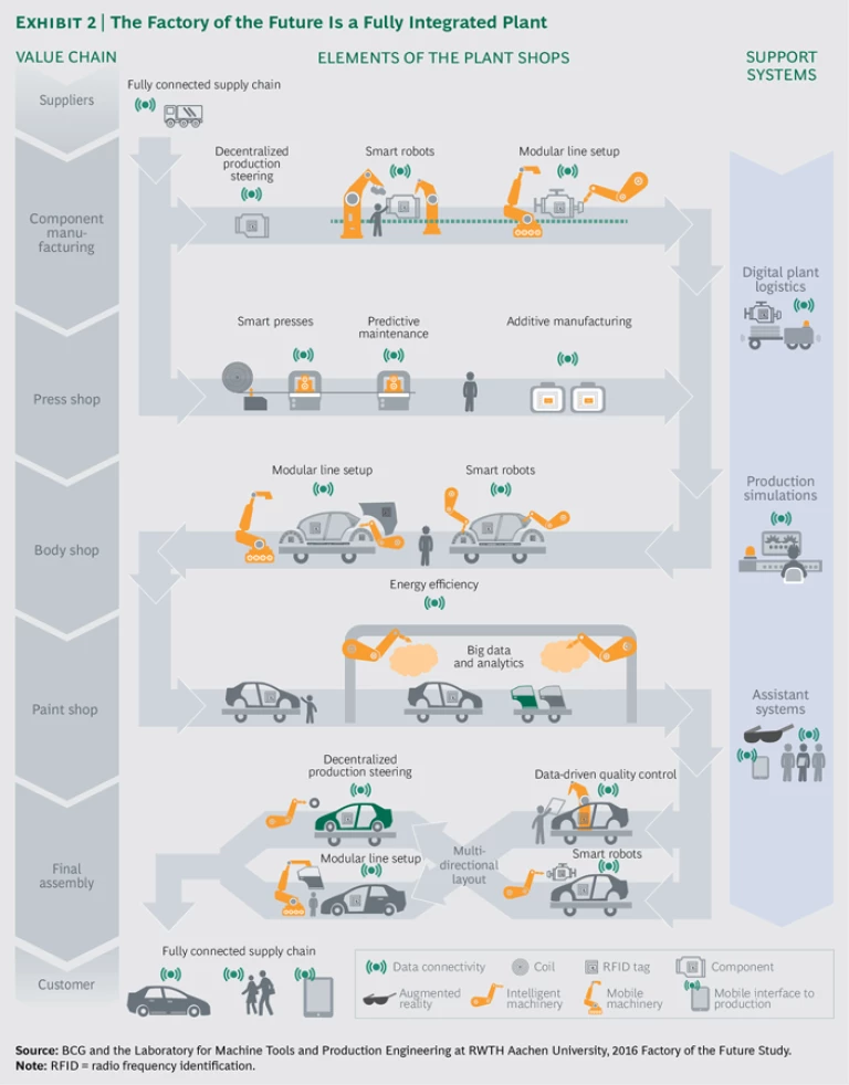 Many manufacturers have started to selectively implement elements of our vision for the factory of the future. Below, we provide many examples of these efforts, most of which are being piloted on a small scale in specific areas of the plant. In order to realize our vision, manufacturers must apply these advances comprehensively throughout their plants and across an integrated value chain.