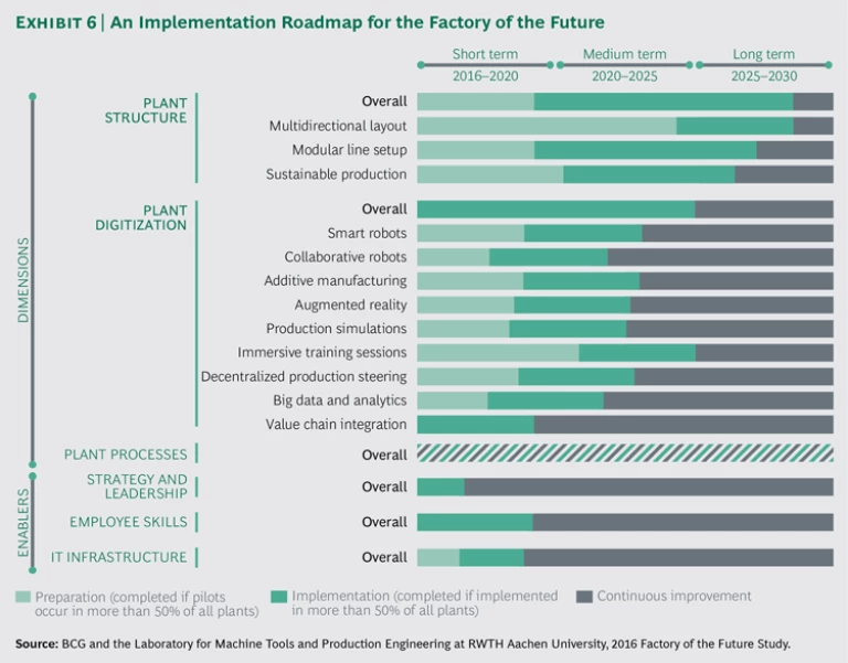 BCG has applied the insights from the study to develop an implementation roadmap for the factory of the future. (See Exhibit 6.) Each manufacturer must tailor the roadmap to its specific starting point. In most cases, manufacturers should focus on plant digitization in the short to medium term, so as to avoid falling behind competitors that are already implementing use cases for digitization. Changes to the plant structure should be pursued in the medium to long term, because these modifications affect all equipment and the plant layout. Such changes are typically undertaken at the same time that plants are overhauled or new product models are launched. For plant processes, manufacturers should continuously implement new technologies to improve processes and customer satisfaction as an extension of their current lean management agenda. Manufacturers should immediately launch efforts to put in place the foundational enablers, because training current employees and hiring new ones, as well as installing an IT infrastructure, are time-consuming efforts.