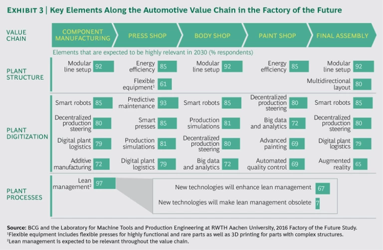 For each plant shop in this integrated value chain, automotive respondents provided insights into what they considered will be the most important elements in the dimensions of plant structure, plant digitization, and plant processes. (See Exhibit 3.)