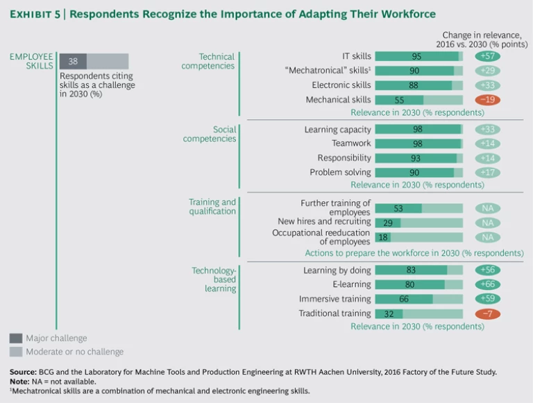 Recognizing that they need to adapt their workforce to the factory of the future, 38% of automotive respondents see employee skills as a major (“big” or “huge”) challenge. (See Exhibit 5.) To ensure that their workforce evolves appropriately, companies must focus on building technical and social competencies. They also must implement new approaches to qualify their employees and ensure that the right skills are in place.