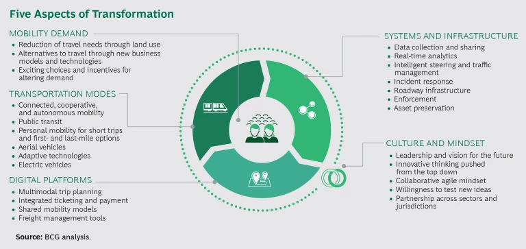 This will not be easy. Building more roads or buying more buses is not a viable solution. The challenge is to rethink how and when roads and buses are used and what tools could optimize the system and reshape the way people travel—or make it easier for them to avoid traveling altogether. To shift demand, create viable alternatives to travel, and provide data that informs smarter decisions, mobility must be tackled in its entirety. An agile approach to transportation can save governments money, future-proof urban-mobility networks, and create transportation choices that underpin economic and social success.