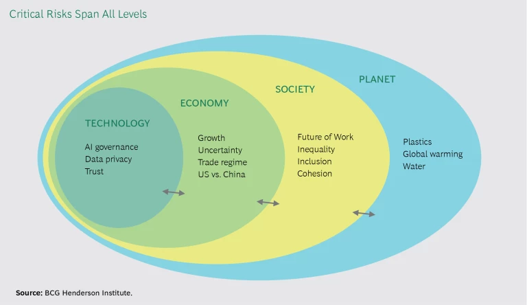 The environment in which global organizations operate is a nested system comprising several levels: technologies, which are part of economies, which are part of societies, which are part of the planet. The risks discussed this week spanned all of these levels.