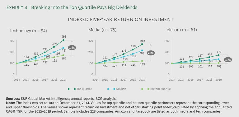 Companies that advance from the top of the bottom quartile to the bottom of the top quartile in value creation will generate outsize returns for shareholders. (See Exhibit 4.) This is especially true for media companies, but it also holds for telecom operators. A dollar invested in an operator ranked at the top of the bottom quartile for the five-year period from 2015 to 2019 would barely have appreciated. A dollar invested in the bottom company of the top quartile would have been worth $1.70.